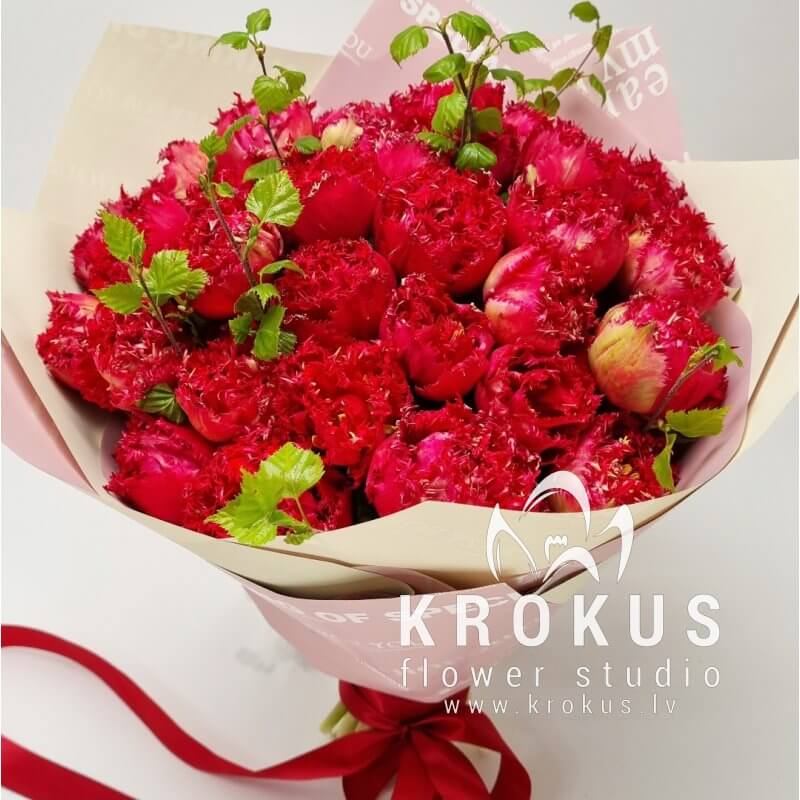 Red fringed tulips is a bouquet of fresh cut flowers. KROKUS is the best online shop, flower delivery in Riga