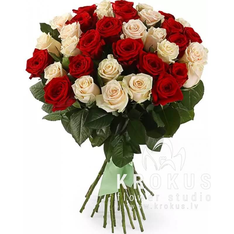 red and cream roses is a bouquet of fresh cut flowers. KROKUS is the best online shop, flower delivery in Riga