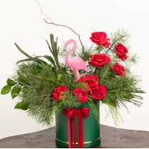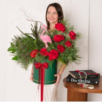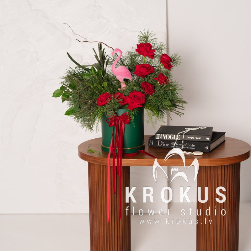 Christmas Composition with Flamingo Decor – an elegant festive arrangement featuring red roses, fir branches, and greenery, adorned with a luxurious red velvet bow. The centerpiece is a pink velvet flamingo, preserving the Christmas memories and doubling as a chic home decoration after the holidays.