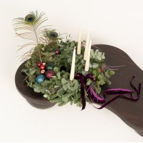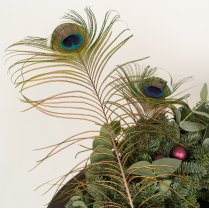 Christmas Composition "Paradise Bird" – an elegant decoration combining luxurious peacock feathers, deep violet velvet ribbons, and sparkling Christmas baubles. This refined and exquisite piece is perfect as a centerpiece for your festive table or as an interior accent, bringing Christmas spirit and sophisticated beauty to your home.