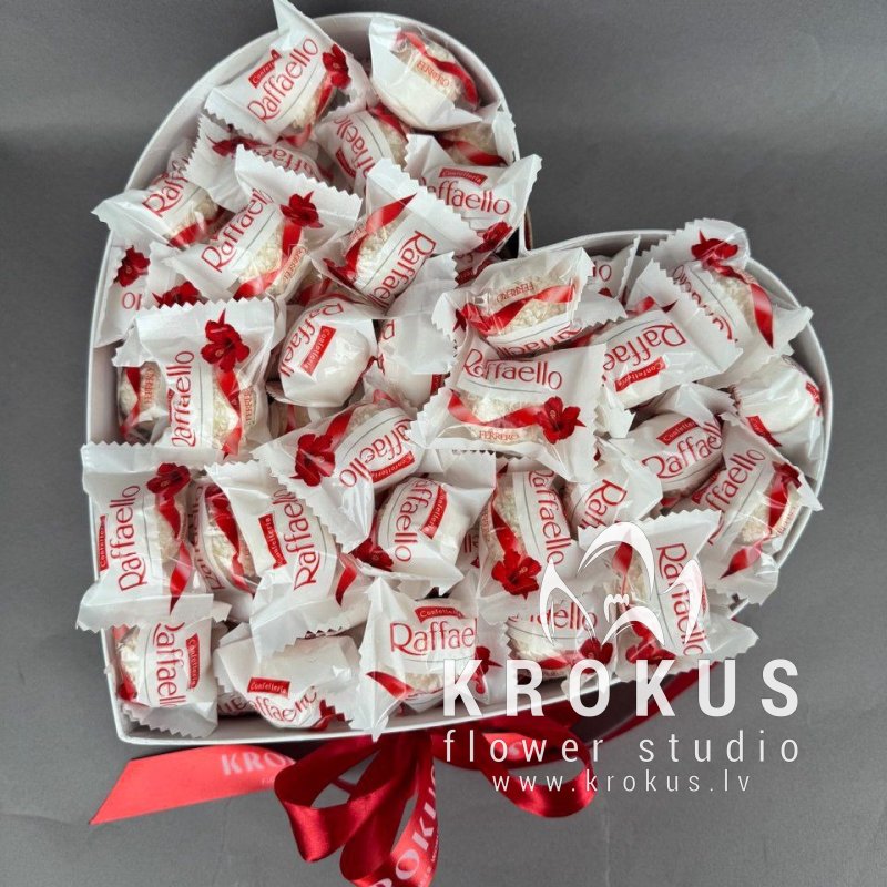 Gift Raffaello heart shape box 900gr and any fresh flowers with delivery in Riga in our online flower shop KROKUS