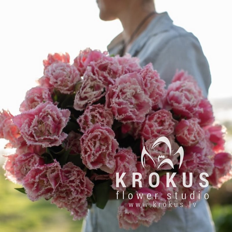 Latvian pink peony-style fringed tulips is a bouquet of fresh cut flowers. KROKUS is the best online shop, flower delivery in Riga