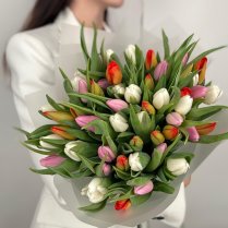 Nopērciet pušķi no svaigiem grieztiem ziediemKrāsainu tulpju pušķis. Šie ir skaisti ziedi, burvēgs pušķis, piega'de pa Rīgu