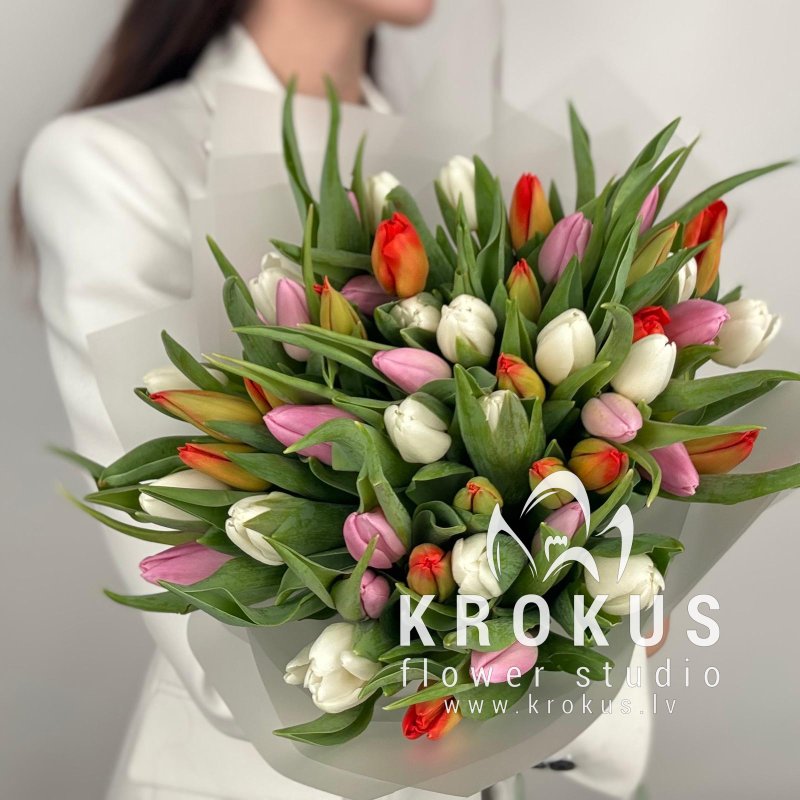 Krāsainu tulpju pušķis šis ir pušķis no svaigiem grieztiem ziediem. KROKUS - labākais ziedu interneta veikals, ziedu piegāde Rīga