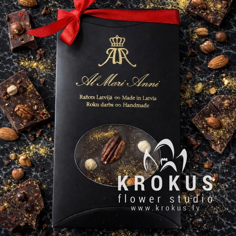 Dāvana Beļģu tumšā šokolāde ar riekstiem un zelta pūderi 80g un jebkādi svaigi ziedi ar piegādi Rīgā mūsu interneta ziedu veikalā KROKUS