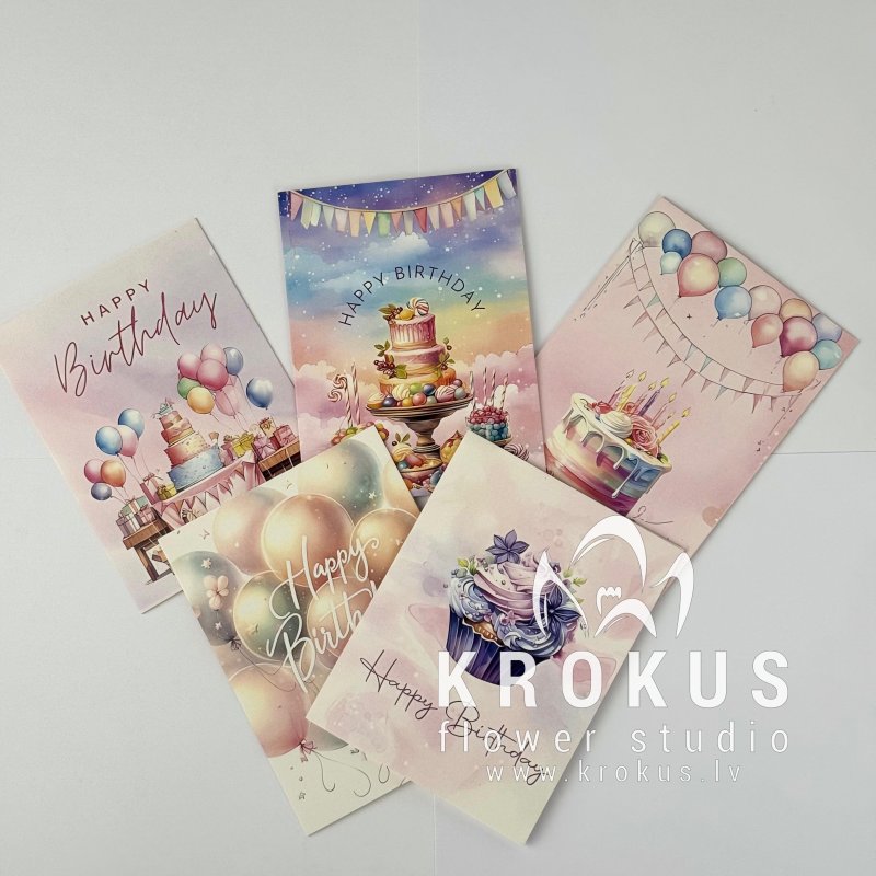 Dāvana Happy Birthday kārtiņa (Nejauša izvēle) 13x10 un jebkādi svaigi ziedi ar piegādi Rīgā mūsu interneta ziedu veikalā KROKUS