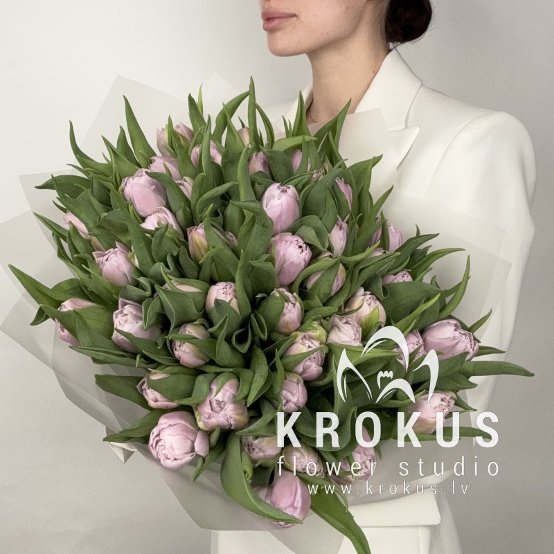 Ceriņkrāsas peonijveida tulpju pušķis šis ir pušķis no svaigiem grieztiem ziediem. KROKUS - labākais ziedu interneta veikals, ziedu piegāde Rīga