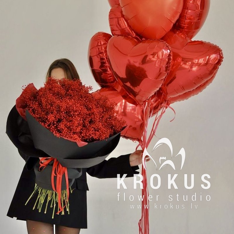 Kompozīciju papildina 9 folijas baloni sirds formā, kas pastiprina “wow” efektu un pārvērš dāvināšanas brīdi par īstu pārsteigumu.