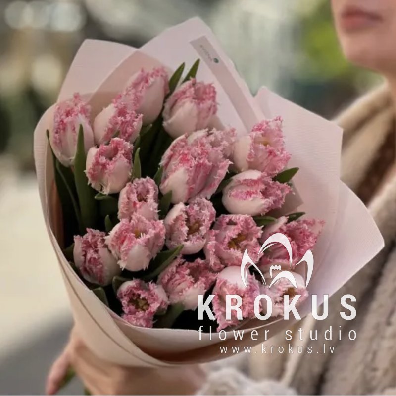 Bārkstainas balti rozā tulpes šis ir pušķis no svaigiem grieztiem ziediem. KROKUS - labākais ziedu interneta veikals, ziedu piegāde Rīga