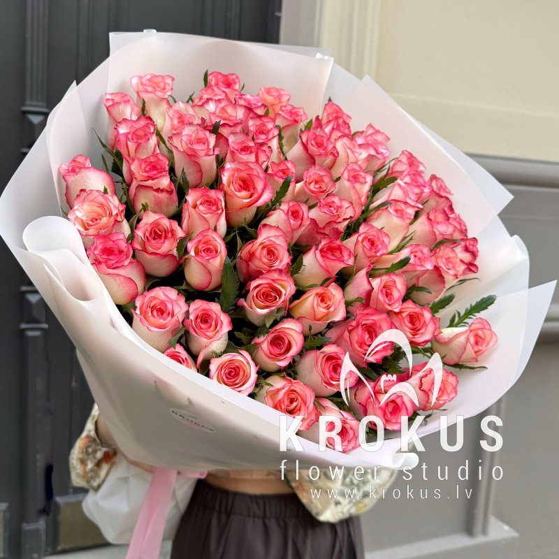 Divkrāsu rozes šis ir pušķis no svaigiem grieztiem ziediem. KROKUS - labākais ziedu interneta veikals, ziedu piegāde Rīga