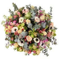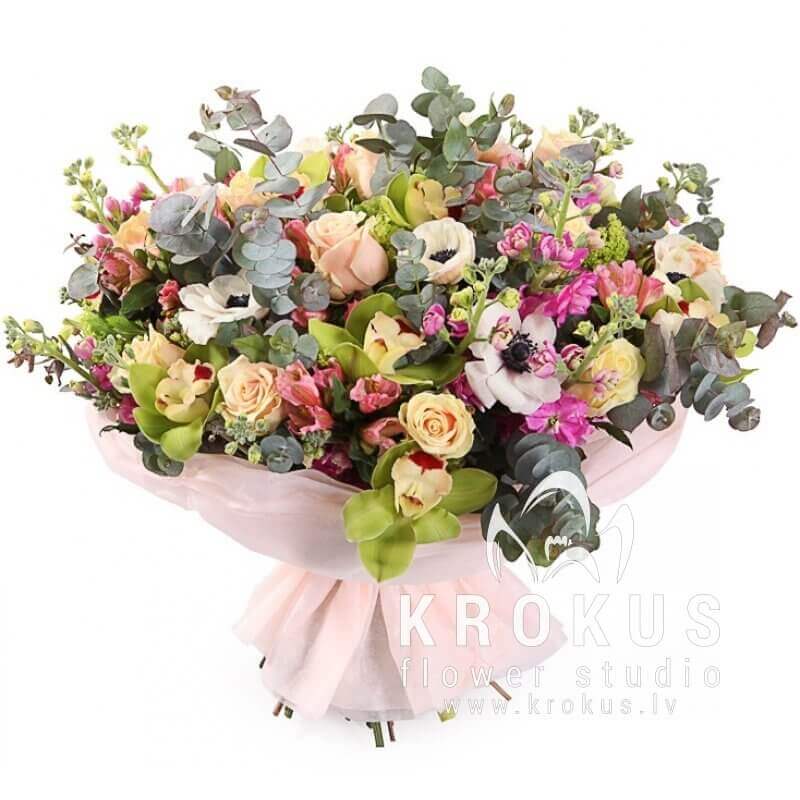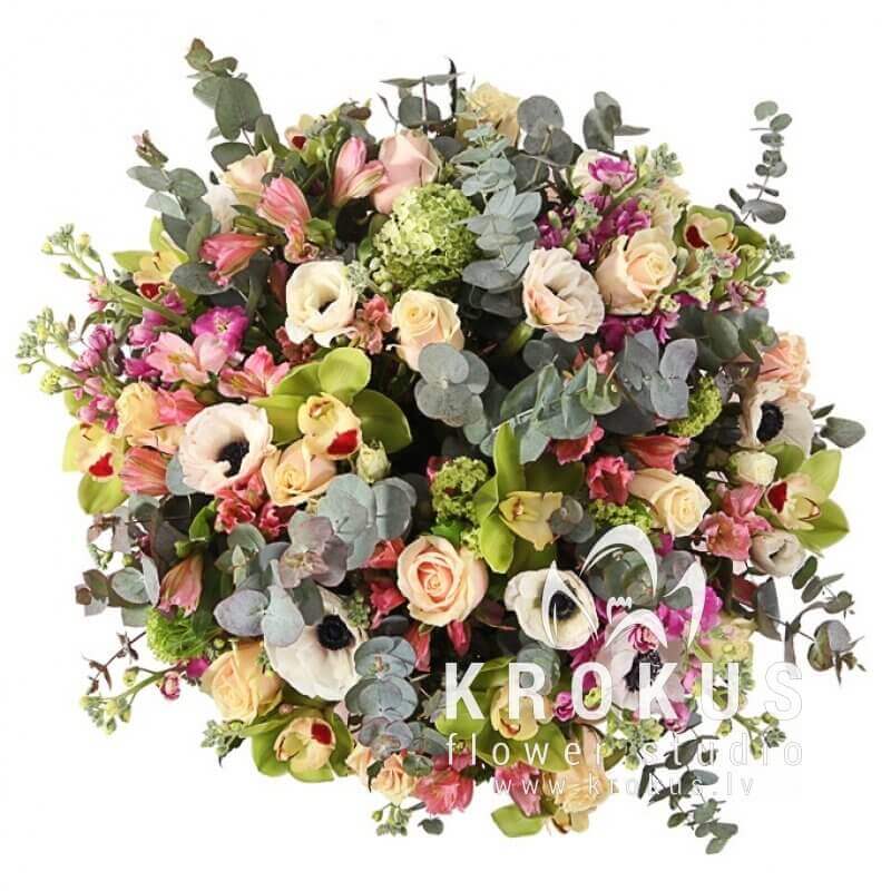 Eikalipts, Dekors, Green bell, Krūmrozes, Lizantes, Orhidejas, Alstremērija, Anemones