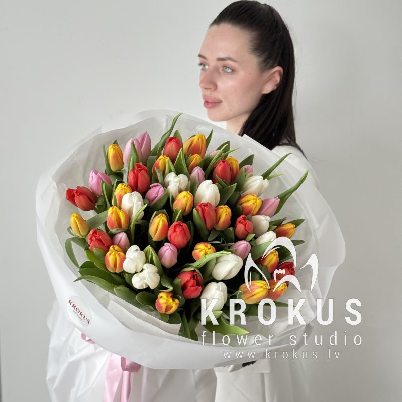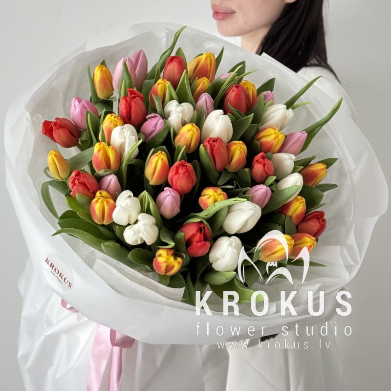 Krāsainu tulpju pušķis šis ir pušķis no svaigiem grieztiem ziediem. KROKUS - labākais ziedu interneta veikals, ziedu piegāde Rīga