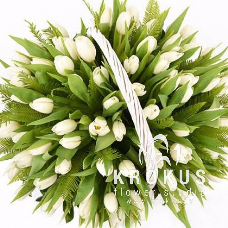 Корзина белых тюльпанов это букет из свежих срезанных цветов. KROKUS - лучший интернет магазин, доставка цветов в Риге