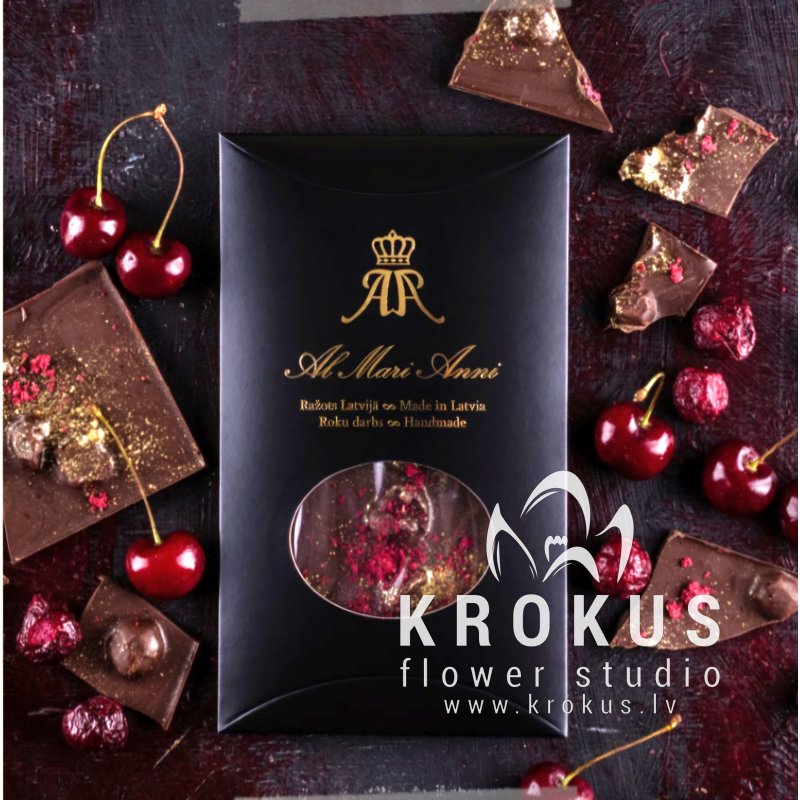 Подарок Бельгийский темный шоколад с вишней и золотом 80g и любые свежие цветы с доставкой по Риге в нашем цветочном онлайн магазине KROKUS