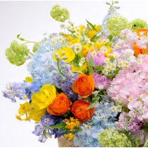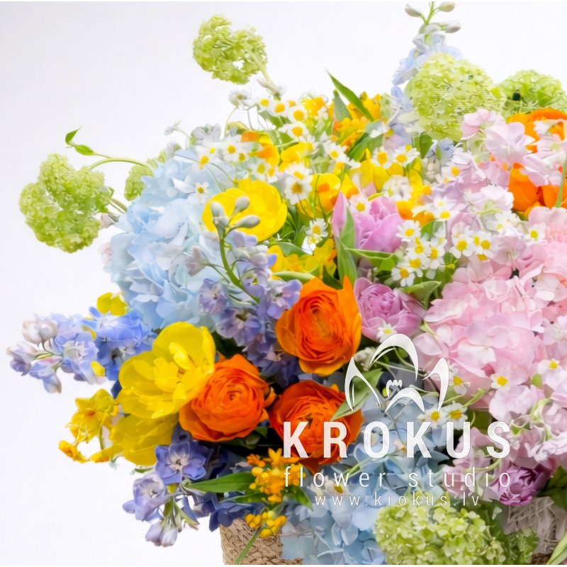 Гортензии, Ранункулюсы, Маттиола, Пионовидные тюльпаны, Ромашки, Нарцисс, Дельфиниум, Вибурнум, Асклепиас