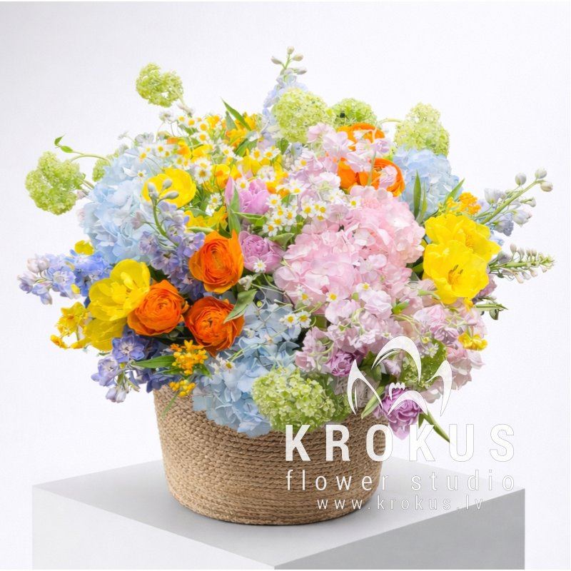 Композиции и букеты цветов в корзине с доставкой в Риге. Солнечный сад - лучшее оформление букета, комфортный выбор, дешевые варианты