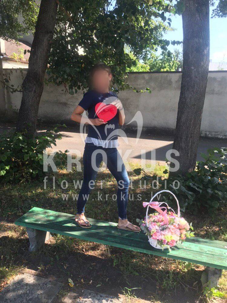 Mēs piegādājām vēl vienu pasūtījumu uz pilsētu Rīga. Pasūtītājs vēlējās: Ziedu Grozs "Beatrise", love is... Košļājamās gumijas